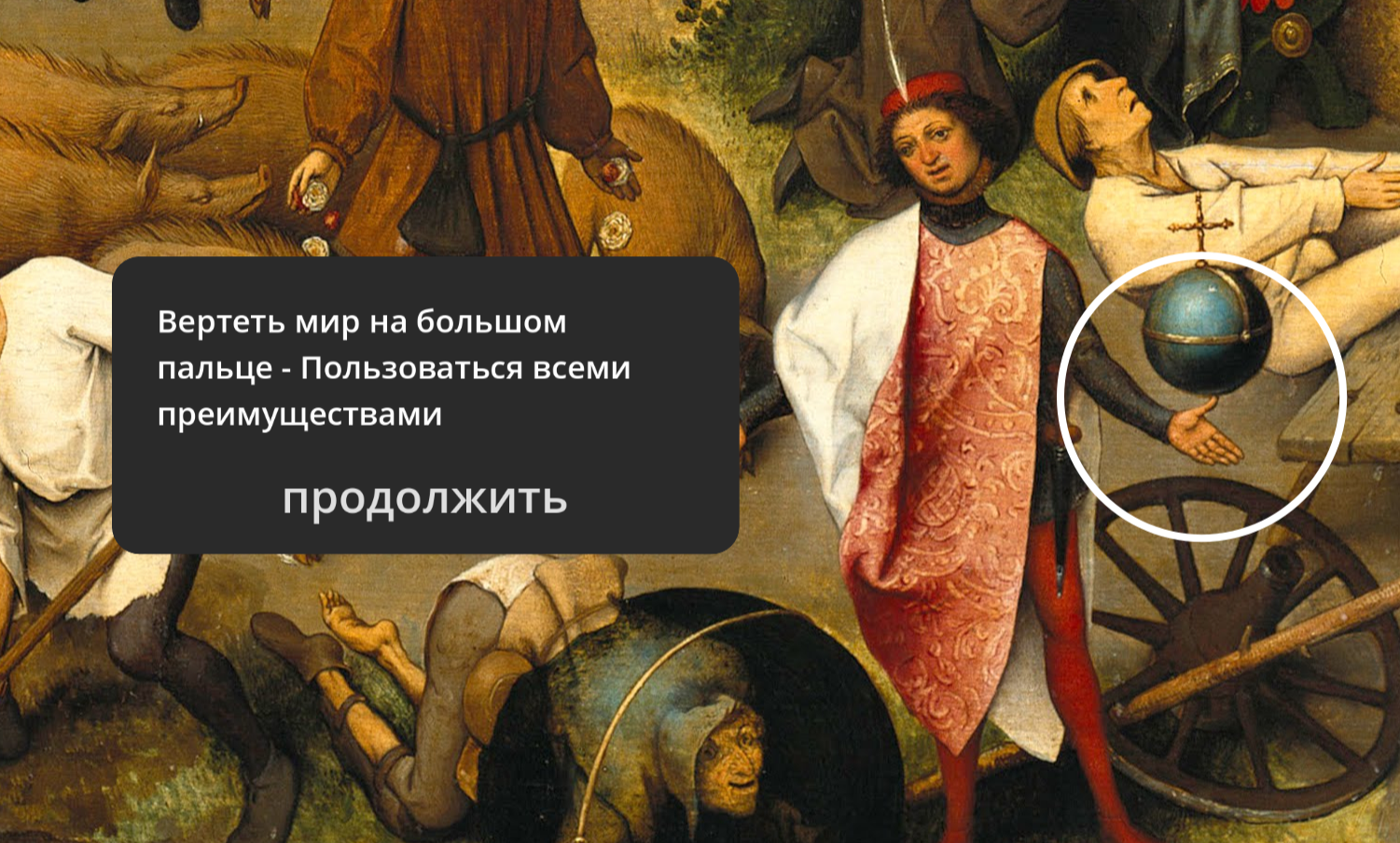 Небольшая игра, посвящённая поиску и знакомству с причудливыми и сюрреалистичными пословицами с картины Питера Брейгеля Старшего «Нидерландские пословицы»!